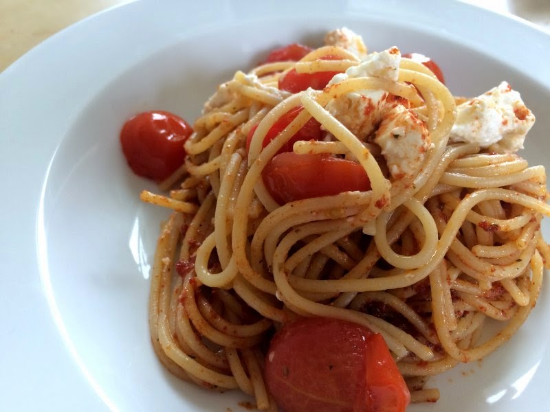 Spaghetti mit Cocktailtomaten und Schafskäse