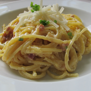 Und gestern, am Sonntag, schließlich haben wir trotz der tropischen Hitze gemeinsam gekocht: Spaghetti Carbonara. Absolut lecker und doch gar nicht so schwer, trotz Sahne und Ei.