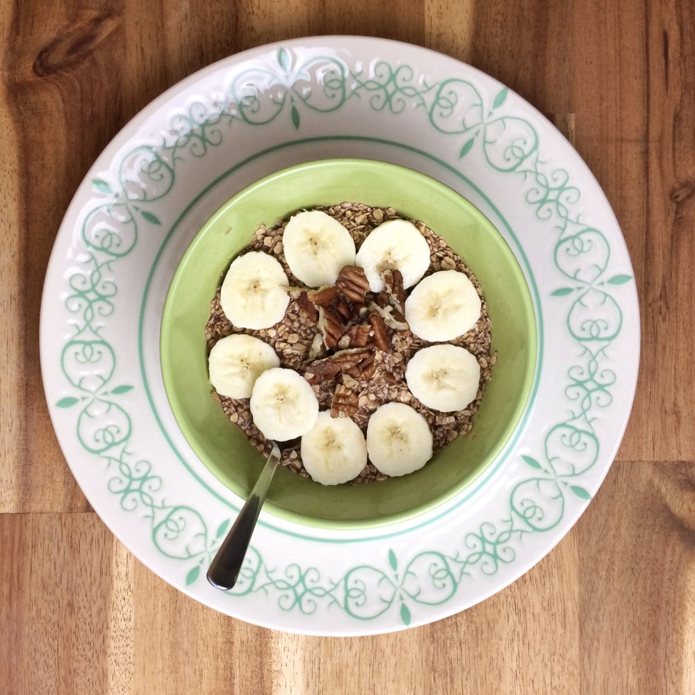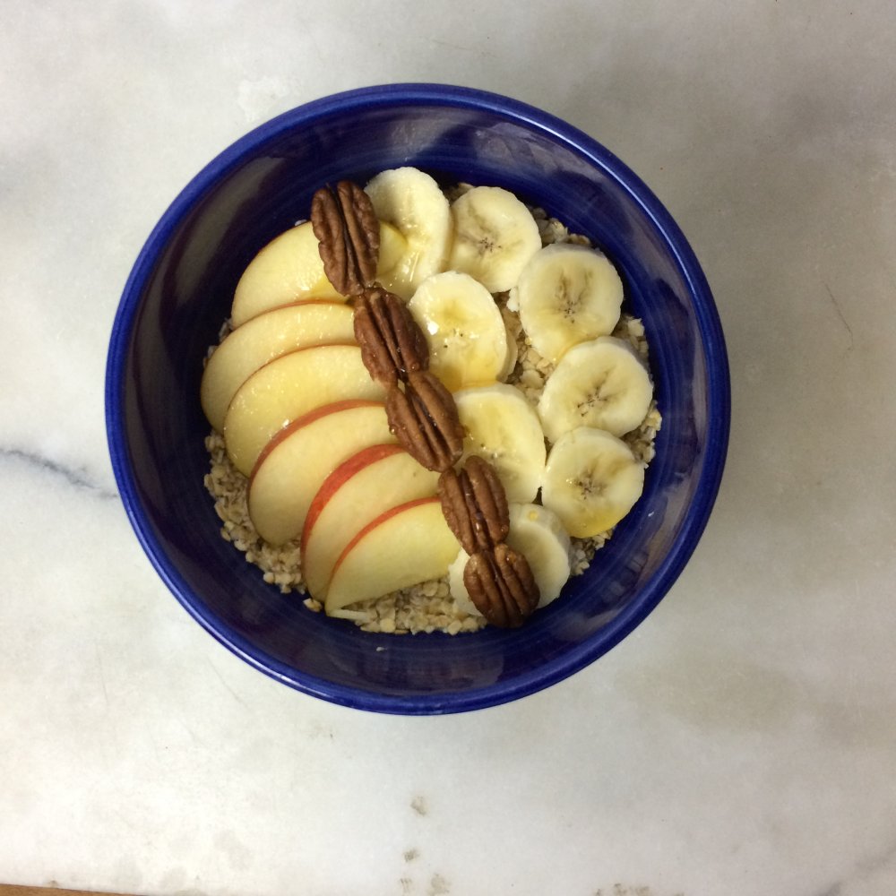 | Frühstück: Haferflocken mit Apfelspalten, Bananen und Pecannüssen |