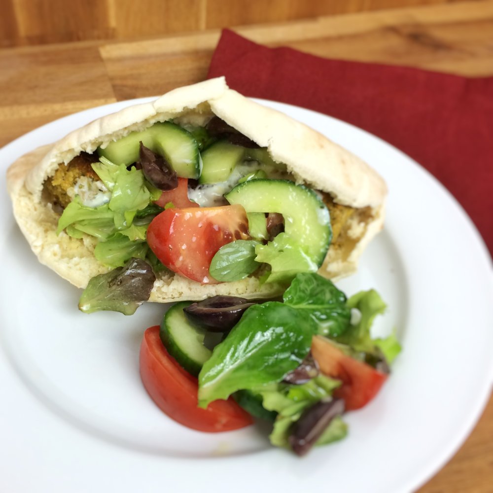 | Mittags (und abends den Rest): Falafeltasche mit veganem Tzatziki und Salat |
